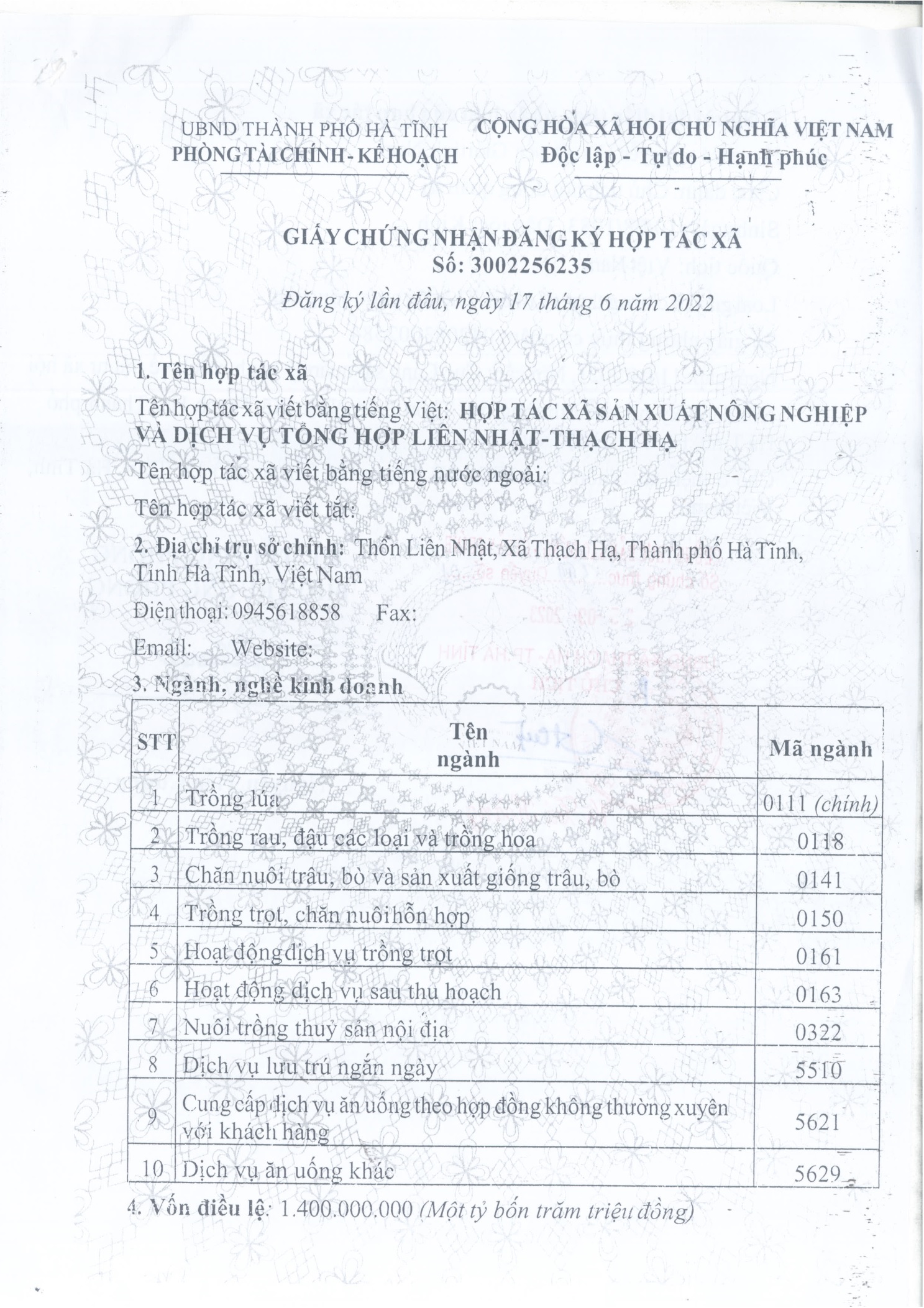 HỢP TÁC XÃ SẢN XUẤT NÔNG NGHIỆP VÀ DỊCH VỤ TỔNG HỢP LIÊN NHẬT-THẠCH HẠ