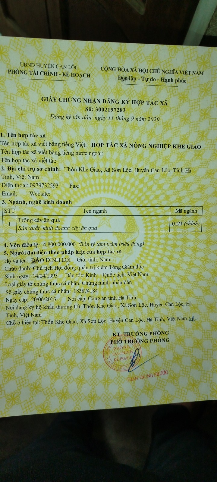 HTX Nông nghiệp cam Khe Giao cơ sở đóng trên địa bàn thôn Khe Giao, xã Sơn Lộc, huyện Can Lộc, tỉnh Hà Tĩnh