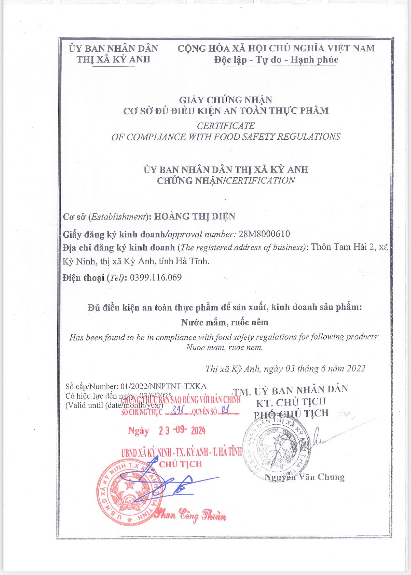 Đậm dà hương vị nước mắm truyền thống Nước măm là linh hôn của âm thực, là văn hóa tinh thần của dân tộc Việt Nam. Bởi từ chiến tranh cho đến thời bình, thậm chí lật lại từng trang sử xưa, ta vân thấy sự hiện diện dày đặc của nước mắm. Tìm đến ven biển Kỳ Ninh, Kỳ Anh, Hà Tĩnh, ta có thê cảm nhận được hương vị mặn mòi của biên quyện vào trong gió, không khỏ để tìm đến cơ sở muối nước mắm Diện Xuân nằm ở TDP Tam Hải 2, phường Kỳ Ninh. Từ đâu ngõ, mùi hương cá chín thơm địu rất đặc trưng đã đánh thức mọi giác quan từ lúc nào. Có thê nói, nghê làm nước măm là sản phâm thê hiện đậm nét côt cách, đặc trưng văn hóa của dân cư ven biên. Đó là mô hôi là nước mặt của bao thê hệ ngư dân bám biên đề đem vê những me cả cơm tươi rõi mang thương hiệu nước mắm Diện Xuân mà chẳng cần ướp đá, muối. Tình túy nhất nằm ở giai đoạn ủ chượp cả và muối. Đề chiết lọc ra những giọt nước mắm cốt chất lượng nhất. Ngoài ty lệ 3 cá: Imuối thì thời gian ù cũng không kém quan trọng. Để đạt độ sánh, mùi thơm vị đậm đà vừa vặn, màu cánh giản đẹp mắt thì khoảng thời gian 1,5 đến 2 năm được xem là lý tưởng. Để tạo ra loại nước mắm đặc biệt này, phải chọn kỹ lưỡng từng con cá, canh muối cho đúng lượng, ủ đúng ngày. Nước mắm Diện Xuân có thành phẩm trải qua hơn 12 tháng, mùa xuân năm nay cá được ngâm trong vại sành thì đến mùa xuân năm sau những giọt nước mắm sóng sánh mới được đong vào từng chai hiện diện trên mâm cơm Phải kỹ lưỡng, trong suốt thời gian ú, người làm phải khuấy cá, lọc ra những con cá khác loại thì mắm mới thom va co min dep. Mho do nuic mam Dien Xuan la san pham noi tieng ca mor ving, din don who sur yeu men của người dân, thứ đặc sản của vùng Kỳ Ninh dã di khắp các tinh thành. Đặc biệt nước mắm Diện Xuân mang đến đặc trưng 4 không: Không sử dụng hóa chất trong quá trình sản xuất, không chất bảo quản, không chất tạo mùi và không chất tạo màu. Cơ sở sản xuất nước mắm Diện Xuân nằm ngay trên điểm trung tâm, là nơi du khách đi thăm đền Chế thẳng phu nhân Nguyễn Thị Bích Châu đi qua. Cơ sở được đầu tư sạch sẽ, khang trang, những chai nước mắm được đóng gói đẹp, bắt mắt. Chúng tôi cam kết sẽ tạo ra một sản phẩm chuẩn của nước mắm Diện Xuân đề từ đó phát triển kinh tế đồng thời thúc đầv phát triên du lích khu vưc.