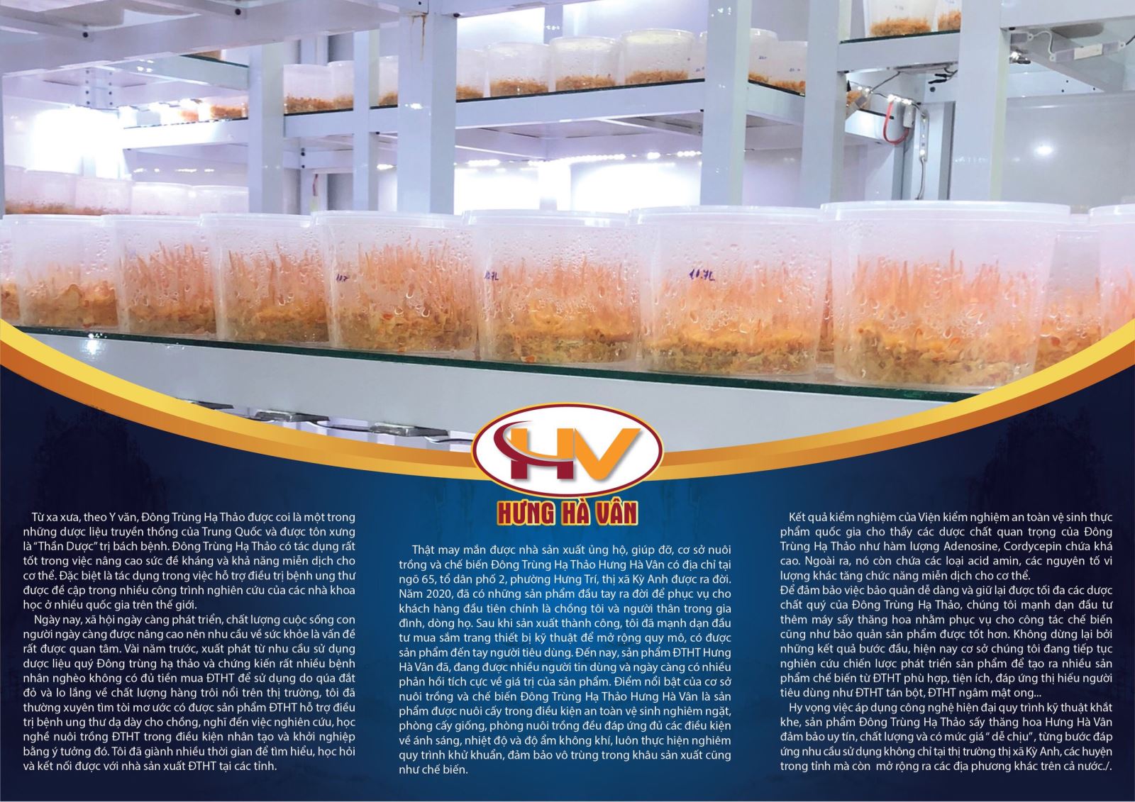 Ngày nay, xã hội ngày càng phát triển, chất lượng cuộc sống con người ngày càng được nâng cao nên nhu cầu về sức khỏe là vấn đề rất được quan tâm. Vài năm trước, xuất phát từ nhu cầu sử dụng dược liệu quý Đông trùng hạ thảo và chứng kiến rất nhiều bệnh nhân nghèo không có đủ tiền mua ĐTHT để sử dụng do qúa đắt đỏ và lo lắng về chất lượng hàng trôi nổi trên thị trường, tôi đã thường xuyên tìm tòi, mơ ước có được sản phẩm ĐTHT hỗ trợ điều trị bệnh ung thư dạ dày cho chồng, nghĩ đến việc nghiên cứu, học nghề nuôi trồng ĐTHT trong điều kiện nhân tạo và khởi nghiệp bằng ý tưởng đó. Tôi đã giành nhiều thời gian để tìm hiểu, học hỏi và kết nối được với nhà sản xuất ĐTHT tại các tỉnh. Thật may mắn được nhà sản xuất ủng hộ, giúp đỡ, cơ sở nuôi trồng và chế biến Đông Trùng Hạ Thảo Hưng Hà Vân có địa chỉ tại ngõ 65, tổ dân phố 2, phường Hưng Trí, thị xã Kỳ Anh được ra đời.