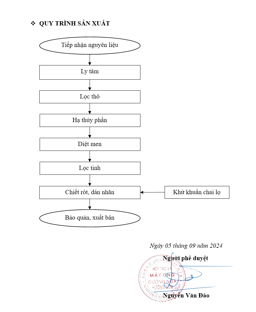 sản phẩm từ các tổ ong, qua kiểm tra bằng máy về chất lượng mật mới khai thác, lọc và xử lý tạp chất bằng công nghệ hạ thủy phần, xử lý men nấm qua dây chuyền, đóng gói vào chai lọ thủy tinh, niêm phong bằng tem truy xuất, bảo quan trong các giá kệ thoáng mát,