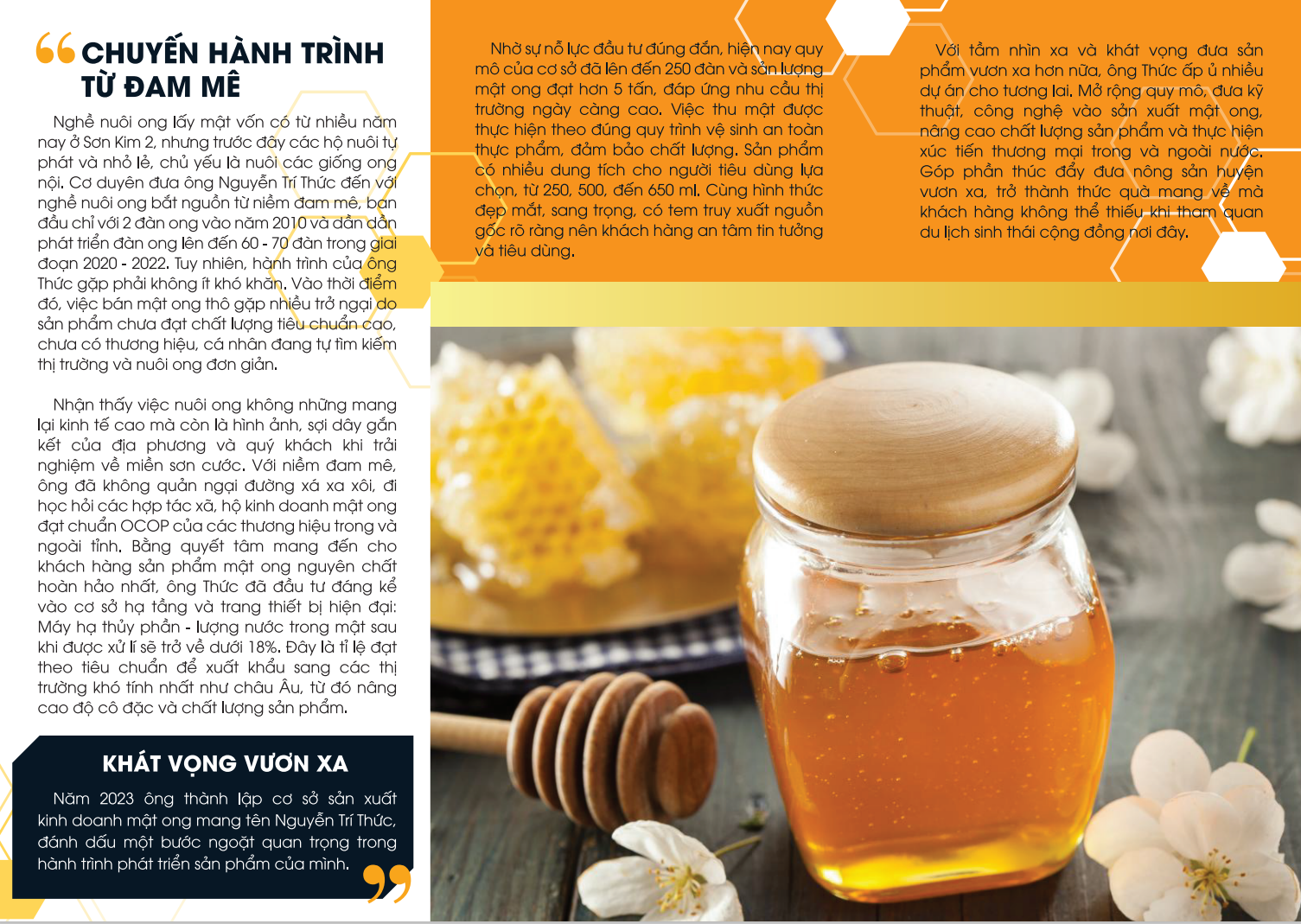 Nghề nuôi ong lấy mật vốn có từ nhiều năm nay ở Sơn Kim 2, nhưng trước đây các hộ nuôi tự phát và nhỏ lẻ, chủ yếu là nuôi các giống ong nội. Cơ duyên đưa ông Nguyễn Trí Thức đến với nghề nuôi ong bắt nguồn từ niềm đam mê, ban đầu chỉ với 2 đàn ong vào năm 2010 và dần dần phát triển đàn ong lên đến 60 - 70 đàn trong giai đoạn 2020 - 2022. Tuy nhiên, hành trình của ông Thức gặp phải không ít khó khăn. Vào thời điểm đó, việc bán mật ong thô gặp nhiều trở ngại do sản phẩm chưa đạt chất lượng tiêu chuẩn cao, chưa có thương hiệu, cá nhân đang tự tìm kiếm thị trường và nuôi ong đơn giản.