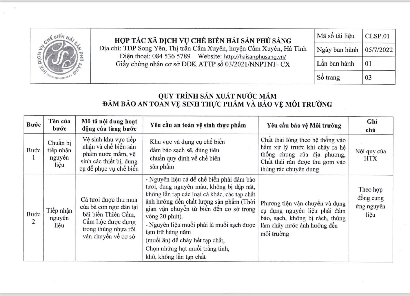 Tên đơn vị/nhà sản xuất: Hợp tác xã dịch vụ chế biến hải sản Phú Sáng