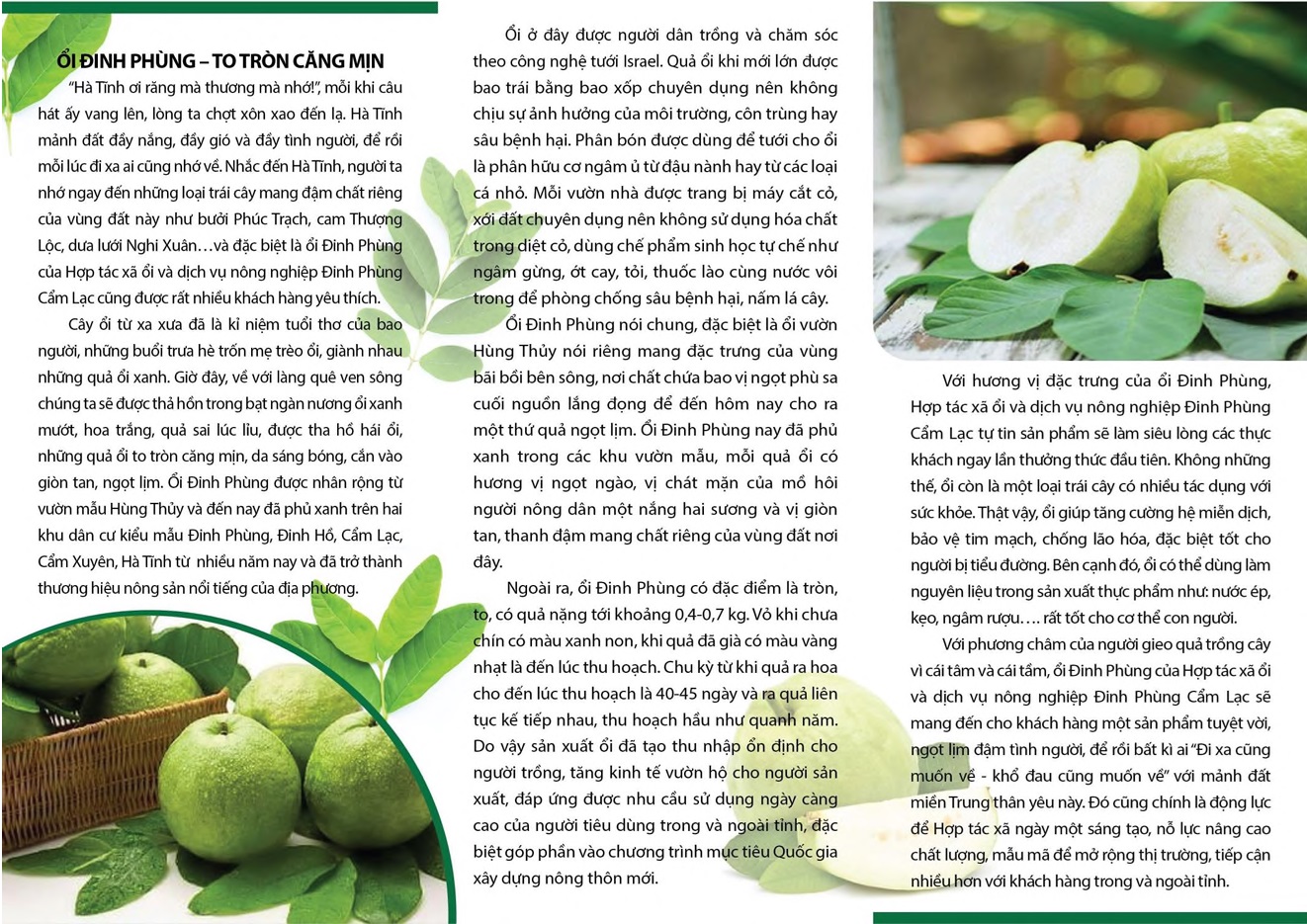 Ổi Đinh Phùng là sản phẩm ổi chất lượng của HTX ổi và dịch vụ nông nghiệp Đinh Phùng Cẩm Lạc được trồng và chăm sóc từ giống ổi lê Đài Loan, trái lớn, cùi dày, rất ít hạt, giòn thơm ngon, vị ngọt mát.