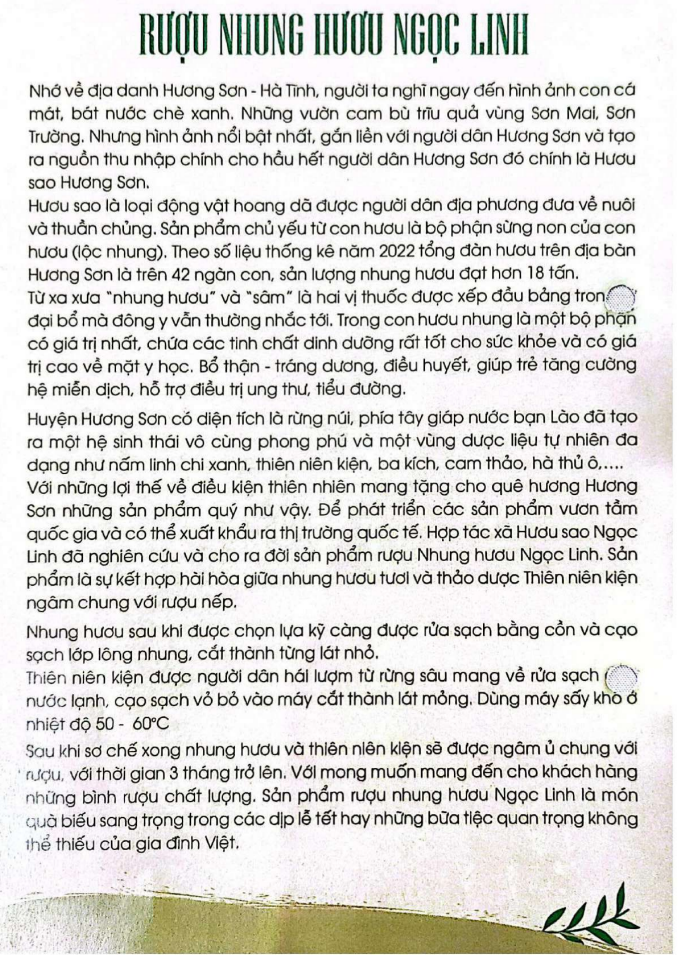 Với những lợi thế về điều kiện thiên nhiên mang tặng cho quê hương Hương Sơn những sản phẩm quý như vậy. Để phát triển các sản phẩm vươn tầm quốc gia và có thể xuất khẩu ra thị trường quốc tế. Hợp tác xã Hươu sao Ngọc Linh đã nghiên cứu và cho ra đời sản phẩm rượu Nhung hươu Ngọc Linh. Sản phẩm là sự kết hợp hài hòa giữa nhung hươu tươi và thảo dược Thiên niên kiện ngâm chung với rượu nếp.